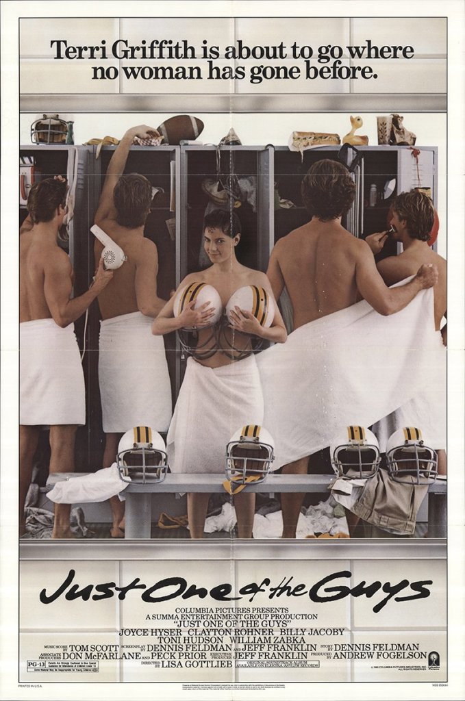 Another movie poster I remember seeing in video stores, Just One Of The Guys (1985) is an eighties teen movie with a high concept twist: Terri (Joyce Hyser) wants to be a journalist and is passed over for a summer internship at a newspaper by her teacher’s sexism, so she decides to go undercover as a “he” at another school (called Sturgess-Wilder School, a tribute to the great screwball comedy masters of old?) to prove she has a nose for news (as her comic relief brother says “What are you, Tootsie? Yentl??”). As described by a young Sherilyn Fenn (who develops a crush on this new kid), this new “boy” dresses like Elvis Costello and talks like Ralph Macchio – it’s all pretty broad and silly. Speaking of Macchio, William Zabka who played the jock bully in The Karate Kid also plays a jock bully in this. Directed by Lisa Gottlieb and co-scripted by Jeff Franklin, the creator of Full House, which gives you a sense of what level the jokes are on in this, and this is a very eighties teen comedy with snooty college guys, nerds who feed reptiles and everyone worrying about who they’re going to take to the prom, and it’s a strange PG rated mix of family friendly and sexualised overtones. Overall, I found it entertaining, and Hyser is charming in the lead. Soundtrack does feature Shalamar, Midnight Star, Dwight Tilley and Ronnie Spector.