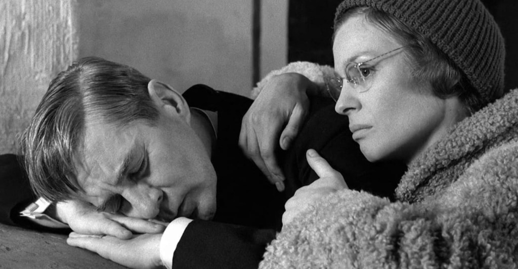 Continuing my education into the work of director Ingmar Bergman, I picked Winter Light (1963; Nattvardsgästerna) to watch next. Mostly on the basis that it’s one of the big inspirations for Paul Schrader’s First Reformed. In that movie, it was a struggling priest dealing with a suicidal parishoner obsessed with climate change apocalypse – here, in Bergman’s original incarnation of the idea, it has to do with cold war fears of nuclear annihilation. However, while an inspiration to Schrader’s movie, it is also a different experience – just as heavy and philosophical, but there’s a different structure, a different tone. The priest, Pastor Tomas (Gunnar Björnstrand) finishes his sermon at the film’s opening, and the way Bergman and his cinematographer Sven Nykvist frame the parishoners and cut to their reactions, creates a small microcosm within this dwindling church attendance. The film’s structure takes place over one day and follows Tomas as he suffers from a cold, forever sweaty, and his own doubts over God while dealing with fisherman Jonas (Max Von Sydow) who despairs over his lack of faith and hope in the world. More devastating is the relationship Tomas has with his devoted lover, Marta (Ingrid Thulin), a school teacher who longs to take care of him but is coldly rejected. Beautiful imagery abounds in the black-and-white cinematography, the way light intrudes into the cold grey interiors. Several sequences are confronting in their emotional content such as Marta’s lengthy letter to Tomas delivered in a medium close up to the camera. It’s a depressing movie but striking in taking seriously the big questions over faith, doubt, human cruelty, and what might be left to believe in. All compacted into a 81 minute run time. While not as confronting to me as Cries and Whispers, I did marvel at its structural tightness and its characterisation, leaving its big questions unanswered and leaving it to the audiences to decide what the ending might mean or conclude. Available to stream on Kanopy. Recommended.