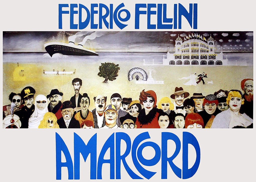 I really became swept up in Amarcord’s (1973) approach to depicting a place, a time, a memory. Directed by Federico Fellini, and while not strictly autobiographical, the film is based on his memories growing up, set in the village of Borgo San Giulano during the 1930s and Benito Mussolini’s Fascism. Rather than having one character as an adult narrate a series of flashbacks, as a more mainstream movie might, Fellini takes a stylistically unique approach, having different people in the town initially speak to the camera – a toothless street person, a long-winded historian who is always rudely interrupted – and observe different pockets of the townspeople, eventually returning to one family and their eldest son Titta Biondi (Bruno Zanin) who looks overgrown in his school boy cap and short pants. There’s one thread of this film that feels like an influence on every randy teen movie afterwards as boys in a Catholic repressed upbringing obsesses over voluptuous bodies and masturbate constantly. Titta’s own obsession is with the glamorous Gradisca (Magali Noel) who waltzes around town like a movie star to everyone’s adoring glances even as rumoured stories about her past become the stuff of myth. Amarcord doesn’t settle into a conventional narrative and has a season structural, moving along in time and taking in another set piece. Opening with a burning ceremony in the town square to the visit of a National Fascist Party official (where most of the towns people are in uniform and happily celebrating) to the oppressive fall out when a gramophone playing The Internationale is discovered. Ostentatious pageantry continues – from school classes to races to weddings – and people of all shapes and sizes, many non actors, are focused upon by the camera. We see reoccurring townspeople and everything is touched by celluloid dreaming from the popularity of the local cinema; the daydreaming fantasies involve larger than life scenarios. When the townspeople all sail out to see the SS Rex, a mammoth ocean liner that is the pride of the government, Fellini shoots it like a big fake prop. In time, there are dark harbingers of what is to come in the following decades, but also the nostalgic rumination of dying family members, local personalities leaving, and rare moments of beauty and grace amongst it all. I was really into its plotless reverie of Amarcord and how it told the tale of a community, both with bemused satire and warm longing, no doubt the Felliniesque influence on everyone from Monty Python to Wes Anderson. The immediately recognisable score is by Nino Rota, cinematography by Giuseppe Rotunno, and it was a critical and commercial success upon release (winning the Academy Award for Best Foreign Picture). Available to stream on the Criterion Channel. Recommended.