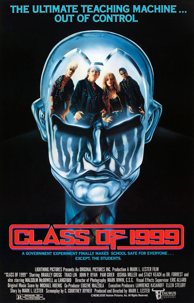 Joanna Gould wrote about Class Of 1999 (1990) for the ‘good bad movies’ issue of VHS Tracking and I’d always been meaning to confront this one. I remember vividly reading about the movie in video store magazines as a kid; the poster and the plot scared the hell out of me, the idea of high school as this nightmarish war zone (the Australian VHS had a Born In The USA type shot of person in jeans standing in the foreground gripping a chain as a weapon in defiance of a shadowy gang by a chain-link fence in the distance). A pseudo-sequel by director Mark L. Lester (in the hall of fame to me for making Commando) to his scuzzy exploitation thriller, Class Of 1984, which crossed Death Wish with The Warriors, as a teacher took revenge on the punk delinquents who made his life hell. In 1999, Lester flipped the formula, added a dash of Robocop and The Terminator, and gave us an Escape From New York intro where a femme robot voice over computer graphics explains that school gangs have gotten out of hand and that the police organised Free Fire Zones around the schools where they didn’t venture and lawlessness reigns. Bit of a plot hole in that if the areas around the schools are lawless, why do the punk gangs still go to school anyway? Something to do, I guess! In any case, hapless principal Malcolm McDowell has made a deal with Megatech corporation honcho Stacy Keach (the first shot where we see Keach with a snow white buzzcat and an epic rat’s tail, along with white contact lenses for his eyes, hooked me in; he gives the wildest performance here). Three teachers – John P Ryan, Pam Grier (!), Patrick Kilpatrick – are secret cyborgs who are part of a new Megatech program in McDowell’s school to keep order and discipline students. Yet as their punishments get too far out of hand, Cody Corp (Bradley Gregg) has to unite the warring gangs (where everyone seems to dress like Corey Feldman circa ‘89) and protect the principal’s daughter (Tracy Lind) from an incoming robo educational take over. This was trashy, gory fun with grey Seattle locations, old school special effects and some groaner one-liners (Cody, after blowing up the chemistry lab, “I guess I blew that course”). I mean it definitely has some horror elements but not as scary as my childhood mind envisioned it. A moderately budget cyber-thriller that descends into a climax of multiple explosions and teen gangs facing off against android teachers. Rented on iTunes. Recommended.