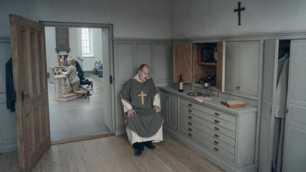 Swedish director Roy Andersson’s films have a distinctive style and tone, which you’ll either be on board for or have no patience with. About Endlessness (2019; Om det oändliga) follows in the tradition of his previous trilogy of movies – Songs From The Second Floor; You, The Living; and A Pigeon Sat On A Branch Contemplating Existence. A series of artfully composed tableaus locked off in master shots for one take, often visual gags that are either funny, sad, sweet or dark. People are given ghastly make up and grey outfits to look even more depressing, and everything is a set constructed in Andersson’s studio often with painted backgrounds. About Endlessness is little over an hour in running time but feels longer as an experience due to the patient way the shots unfold and the scenes change without much of an overriding narrative. Here, I felt I could pick up the subtle connections between scenes, contrasting the one that came before by featuring the same item – a knife – or a different take on a similar theme – not knowing what to do, knowing what to do and failing. The first image is of a couple – a man and a woman – holding each other as they emerge from clouds of mist and smoke, floating in the sky, high above a city of ruins. A woman’s voice often is heard narrating scenes, “I once saw a man…”, and concepts of eternity, energy and facets of life are explored in each scene. The film often never goes for an obvious joke and lets the mundane play out to the point of its innate surreal ridiculousness. A recurring character is a priest who has lost his faith – all he can do is drink and cry, bemoaning like a little child, “What can I do if I’ve lost my faith?” There’s something both sad and hilarious about this exaggerated misery, and the prosaic reactions by the people around him. I love how Roy Anderrson’s movies are specific to Sweden and European history, but there’s a universality I think in how it makes an audience reframe living experience. Life is depressing and beautiful in equal turns, and there’s enough distancing technique and wonderful craft that allows me to sometimes laugh at the horror. Available to stream on SBS On Demand. Recommended.