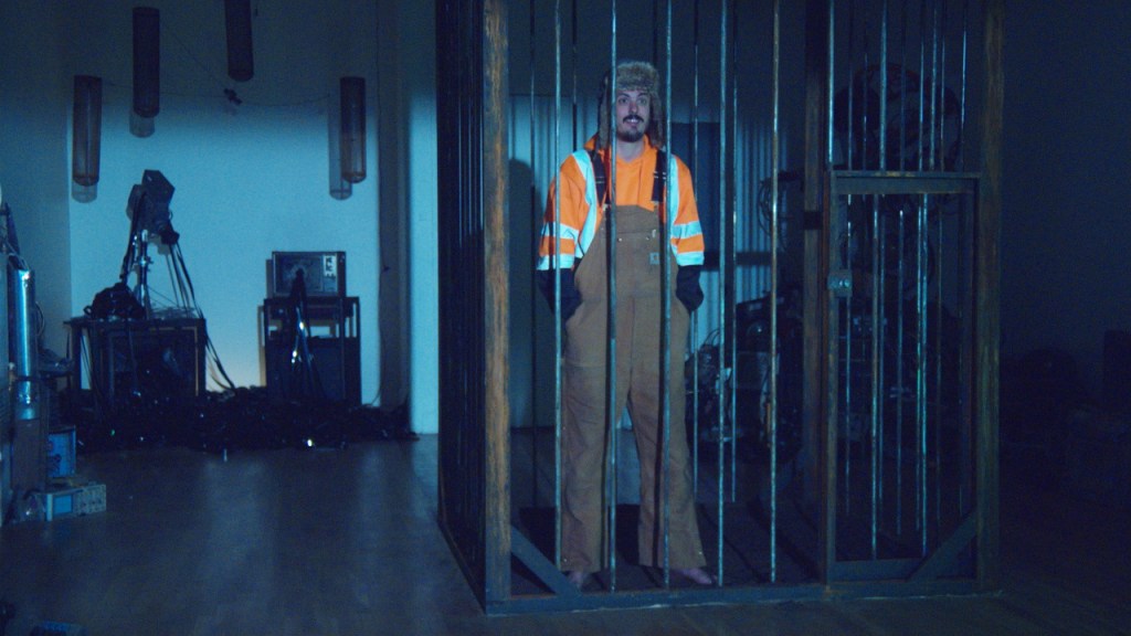 “You’re like art defenders… you ever see that movie, Monuments Men?” While I didn’t like George Clooney’s WWII drama, I did love it being referenced in the film, Project Space 13 (2021), spoken by an artist character named Nate (Keith Poulson) who is describing how he views the two heavily armed private security guards, Ace (Theodore Bouloukos), a middle aged conspiracy theorist, and Evan (Hunter Zimny), a young, aimless dude, who have been hired to protect a New York gallery in Soho. Nate is self-imprisoned in a cage within the gallery and being fed and tortured by a robot as a performance art piece of endurance. The set-up of the movie is like a play. The guards are protecting the gallery for one night when riots are happening outside in the wave of COVID panic and absent police – and thus the guards are stuck inside, spending time with Nate who condescends and argues with them about their place in the system. The trio bicker, they monologue, they receive increasingly emphatic phone calls from the gallery owner Pieter (Jason Grisell) who hired them and is stuck in transit within a limo passing through the riots in an attempt to escape the city for safety. Project Space 13 is a hilarious micro-budget NY indie satire shot during the pandemic in a couple of days. Even though it takes place basically shot in one room for an hour running time, DP Sean Price Williams (Good Time, Her Smell) works his magic by making everything beautifully lit and visually dynamic within the digital video aesthetic. Director Michael M. Bilandic, who wrote the script, has a great handle on tone – the satire is both grounded and heightened, which all of the actors perform winningly and keep in balance, feeling both realistic and funny at the same time. Alongside Bad Luck Banging Or Loony Porn, this is one of the better movies shot during the COVID era that references its ongoing impact. I was laughing solidly throughout. I definitely want to catch up with Bilandic’s previous movies now (Hellaware, Jobe’z World). Project Space 13 is available to stream on Mubi in Australia. Recommended.