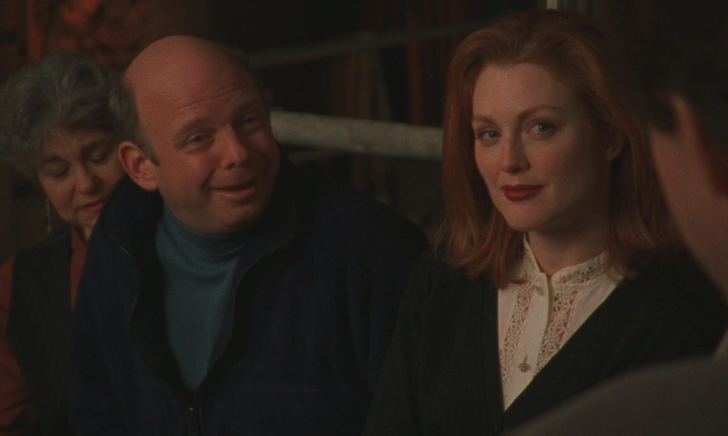 The actors mainly sit around tables, or chairs and couches set up on the stage, and we often hear sirens in the distance from the street. Yet I was pulled into the text through the performances and the cinematography, the use of close-ups and lighting drawing on the shadows of the empty theatre. Recognisable faces from movies demonstrate their theatre bona fides like George Gaynes (from the Police Academy series) and Wallace Shawn as Vanya (whose voice and likeness always echoes the comedy mainstream recognition of his parts in the Princess Bride or the Toy Story movies). The character of Vanya exists as a kind of cynical clown on the side-lines in the middle of the drama, based on the sickly, older academic Professor Serebryakov (Gaynes), his younger second wife Yelena (Julianne Moore), his daughter from the first marriage Sonya (Brooke Smith, Silence of the Lambs), and the visiting Dr. Astrov (Pine, Sandy from Succession). Vanya was the brother to Serebryakov’s first wife who passed away, and he and his niece Sonya maintain the country estate for the distinguished professor, who is plagued by health issues, and his younger, bored wife. There is a love triangle between Dr. Astrov, Sonya and Yelena, and multiple disappointments are aired in this site of decay and slow ruin. The sense of regret and frustration is everywhere, particularly reckoning with getting older and being frustrated with your fruitless position in the scheme of things.