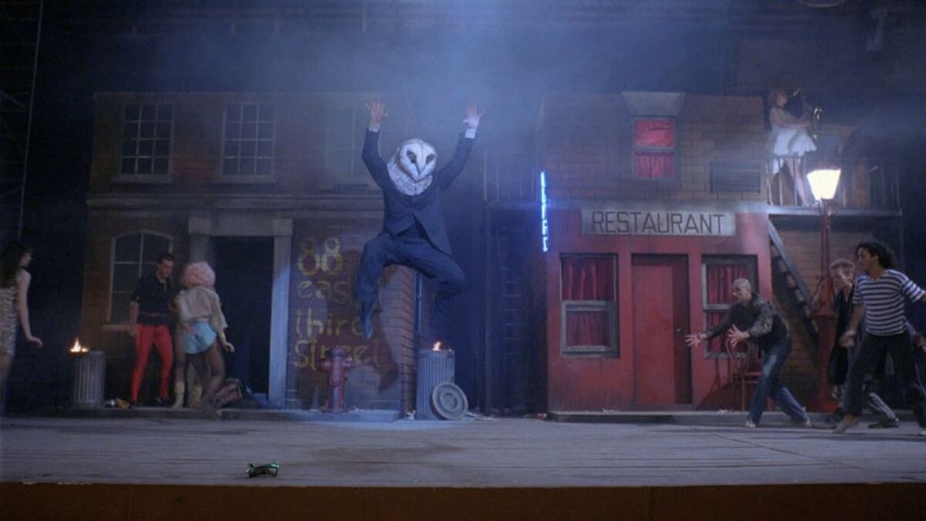 The killer wears an owl’s head mask. A bulky, feathery mask with dark eyes and a beak. What a fantastic look! And now imagine an actor wearing that owl’s head with a suit and flying through the air on stage during rehearsal for a musical rock number. This happens in the first five minutes of Stage Fright: Aquarius (1987) and at that point, how could it get any better? It will. That owl’s head is first worn by an actor in a musical that’s set to open soon, which is bizarrely about a psychopathic killer of women. Then later, that very same owl-head is worn by a psychopathic actor (not just any psycho killer but one who used to be an actor!) who has escaped from a mental hospital! The killer proceeds to lock both cast and crew into the theatre with him during one dark and stormy night.