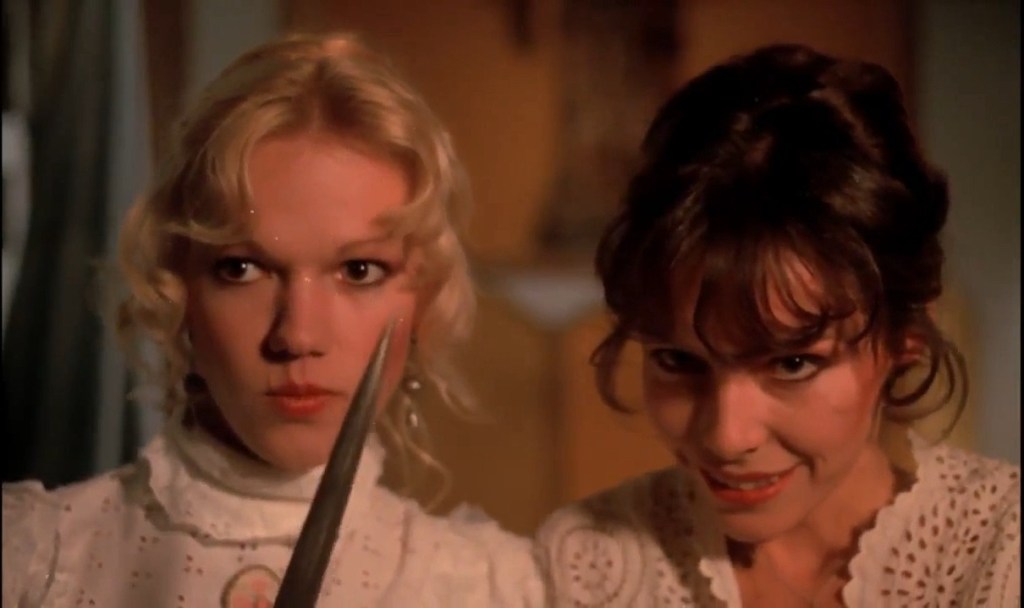Fascination (1979) is one of Rollin’s most popular films, and that might be because it has such a strong image that adorns the poster and is the focus of a three minute sequence. Brigitte Lahaie, nude underneath a flowing black robe, brandishing a scythe and moving towards the camera with murderous intent. What dreams are made of, well, a perve’s dreams…