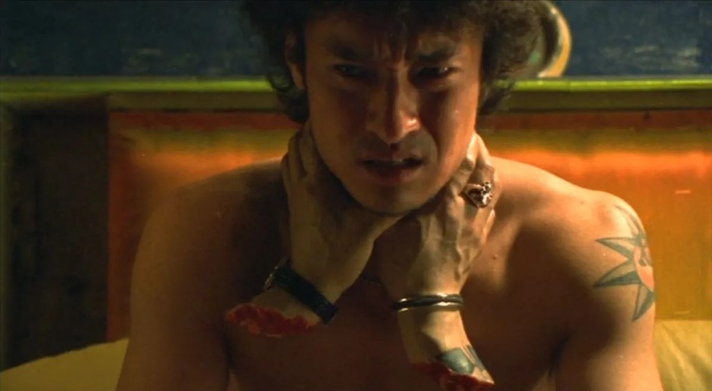 There’s something distinctive he adds, from style to the tone, and in Deadly Outlaw: Rekka (2002), the opening sequence hits you with a pulsating energy as the movie cuts between several scenes while we hear the acid rock of the Flowering Travel Band (their album Satori basically soundtracks the movie at key points). As a senior gang leader is assassinated by a younger, punk-styled footsoldier, Kunisada (Riki Takeuchi) sits in a police interrogation office, vibrating with rage. Turns out Kunisada is not just the assassinated gang leader’s lieutenant, he’s also his son, swearing revenge even as the rival gangs broker peace and repair order to get back to business as usual.