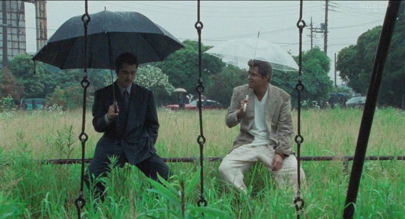 There’s a clear divide between the older Yakuza leaders meeting in rooms, offering each other gifts and packages, organising their underlings to kill, while the foot-soldiers congregate in houses or the streets. Even with Takeuchi sneering and glowering, preparing himself for war by dyeing his hair grey (as a tribute to his dad), the film is mostly a hang-out as Kunisada and his main offsider strut around, spending time with two Korean girls, receiving tips on what their next move should be, etc. There are sincere displays of loyalty amongst Kunisada’s crew, bits of bizarre comedy such as the interactions between the assassin duo responsible for the hit, and then escalations into over-the-top craziness such as Kunisada strutting around at night and using a rocket launcher to settle the score.